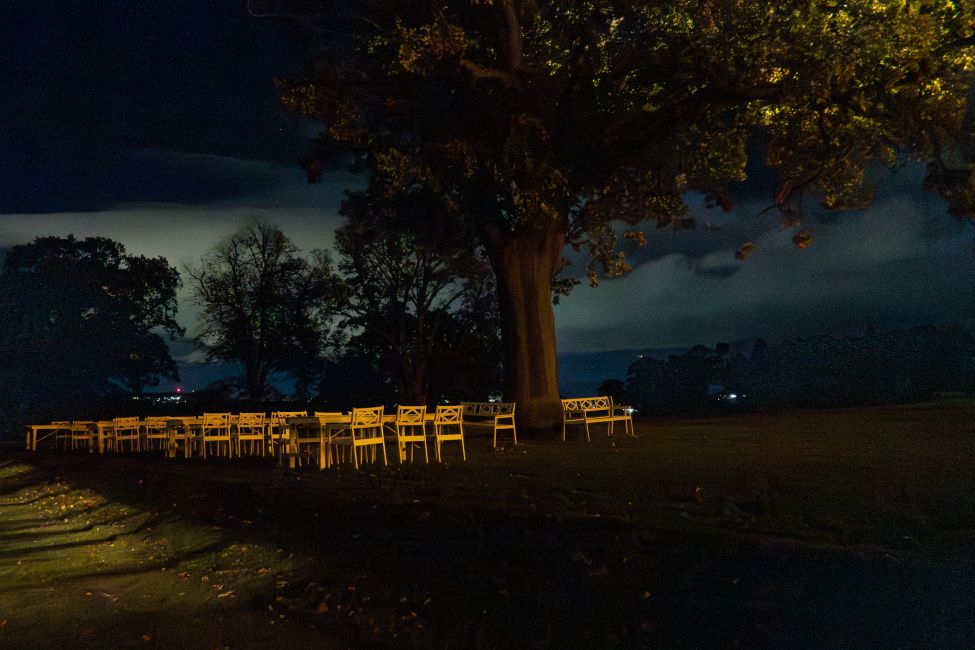Οι άδειες καρέκλες μετατρέπουν το βραδινό τοπίο σε σκηνικό θεάτρου. Λίγο πριν την αρχή ή μετά το τέλος μιας παράστασης με άγνωστη ταυτότητα.