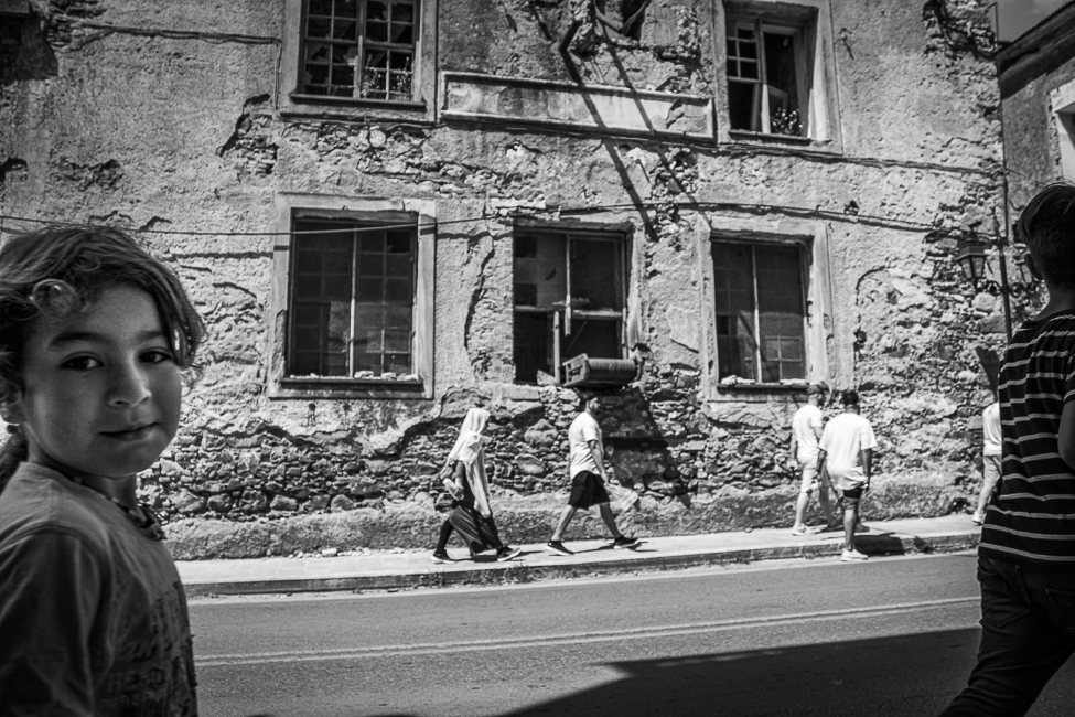 Εκείνο το μεσημέρι σε ένα αγαπημένο μου τόπο, εκατοντάδες άνθρωποι περπατούσαν από το κέντρο της Μυτιλήνης προς τον Μανταμάδο για να λάβουν μέρος σε μια θρησκευτική γιορτή, αναμεμειγμένοι με πρόσφυγες που ζούσαν στο κολαστήριο της Μόριας. Προσπαθούσα να αποτυπώσω την παρουσία ανθρώπων, κίνησης, ζωής, ανάμεσα στα μισογκρεμισμένα κτίρια στην Επάνω Σκάλα της Μυτιλήνης. Ο ήλιος έκανε την επιλογή λευκής ενδυμασίας μονόδρομο για τους περιπατητές και μια από τις πρώτες σκέψεις ήταν να καταγράψω την κίνηση με αργή ταχύτητα κλείστρου, σαν να βγαίνουν φαντάσματα από τα γκρεμίδια άλλα ποιος τα έβαλε με τον ήλιο και κέρδισε; Μετά από πολλά πειράματα και αποτυχημένες λήψεις, κάποια στιγμή στο σκόπευτρο έχω μια παρέα ανθρώπων, ντυμένων στα λευκά απέναντί μου, περιμένω να περάσει ένα αγοράκι και μόλις αυτό φτάσει στην άκρη του κάδρου ‘κλικ’. Ένα από τα εκατοντάδες κλικ της ημέρας. Όταν κοίταξα στην οθόνη της κάμερας για να δω τι έβγαλα είδα στο αριστερό άκρο του κάδρου ένα κοριτσάκι να μου χαμογελά. Δεν το είχα δει να έρχεται. Το βλέμμα, το χαμόγελο, η συγκυρία δούλεψαν χωρίς να το έχω σχεδιάσει. Η αποφασιστική στιγμή με βρήκε.