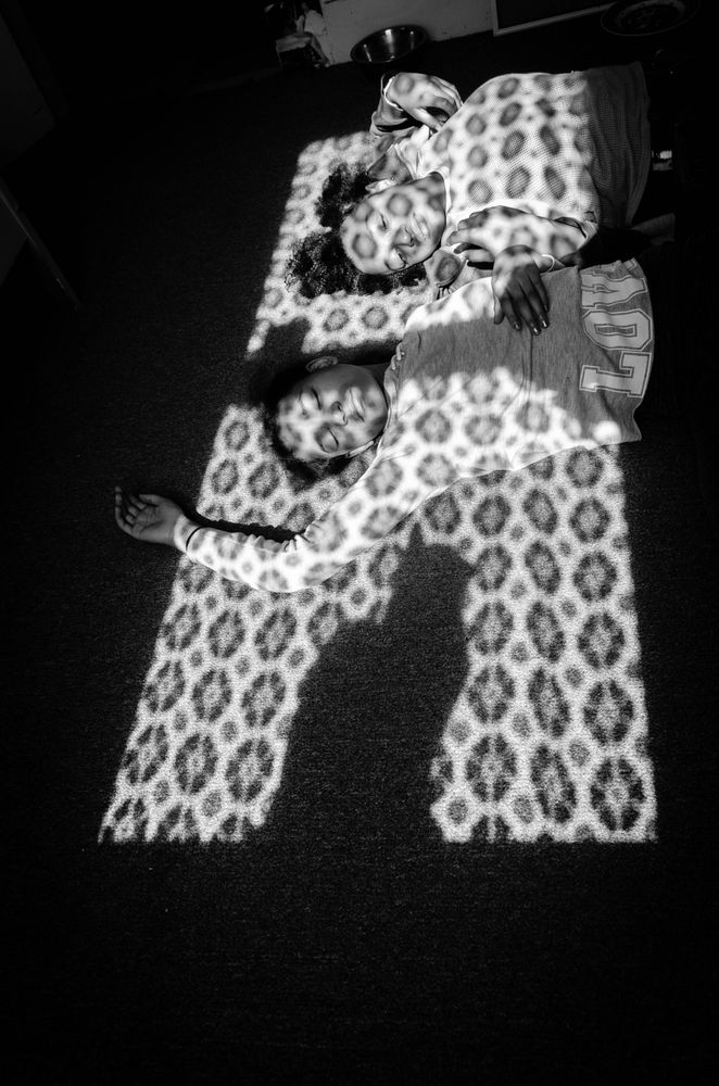 Bella and Katha are sisters who recently moved to Madrid. They live in a little flat at the outskirts of the city while they look for a job. I wanted to photograph them under the hard Spanish sun. At their kitchen, hiding beyond a window and half obscured by the deep shadows, they look like the same person. © Santiago Gonzalez-Barros