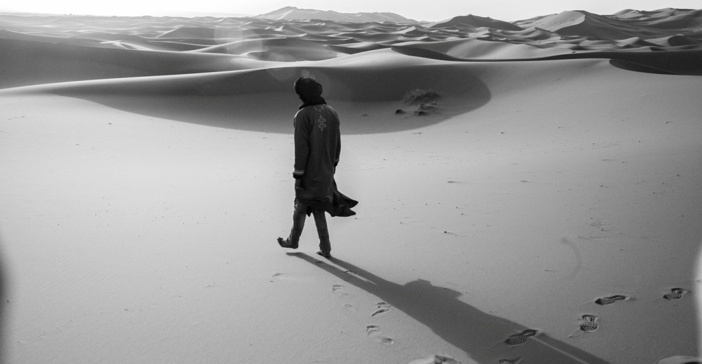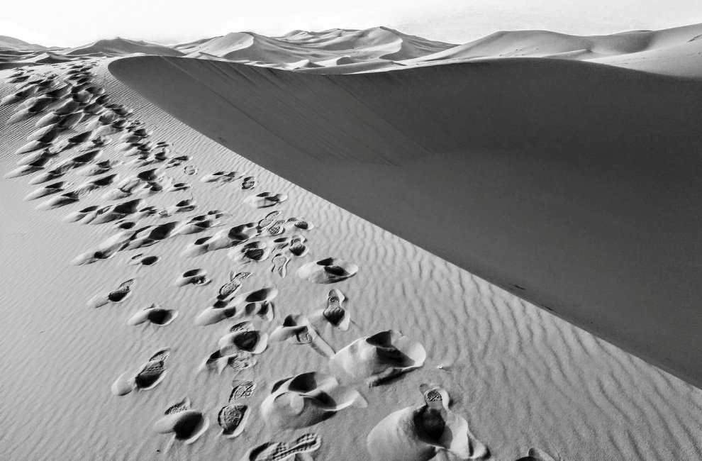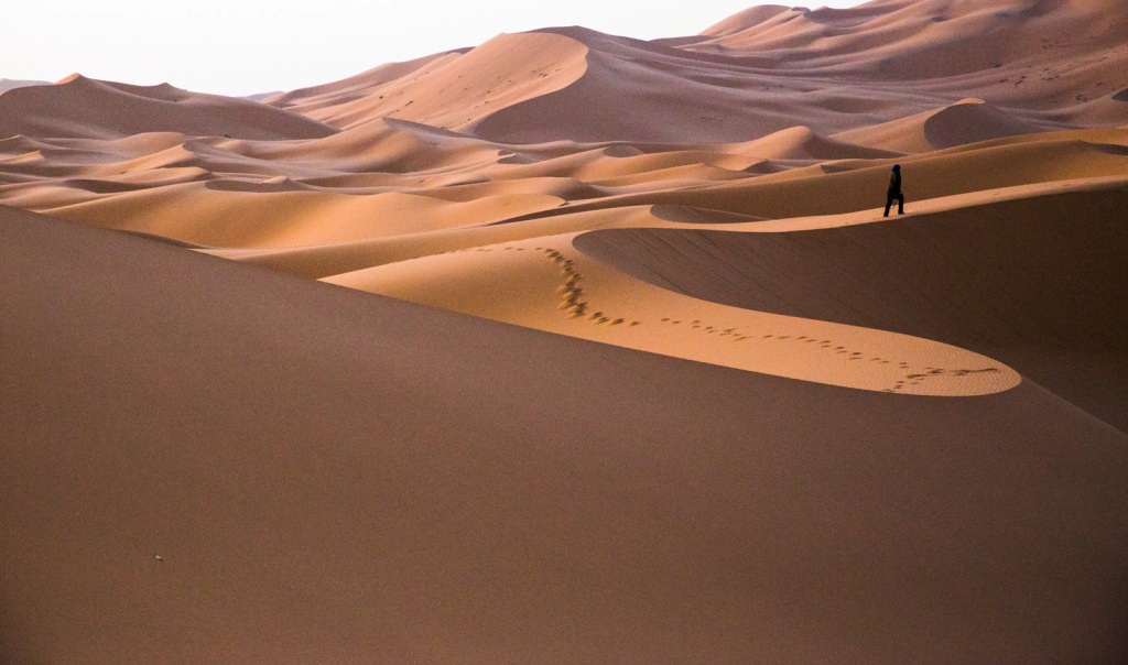 Πριν την ανατολή, κυματιστές επιφάνειες παχιάς άμμου που βουλιάζουν τα πόδια όπως στο χιόνι. Απέραντη έκταση σαν μεγάλη κυματιστή θάλασσα.