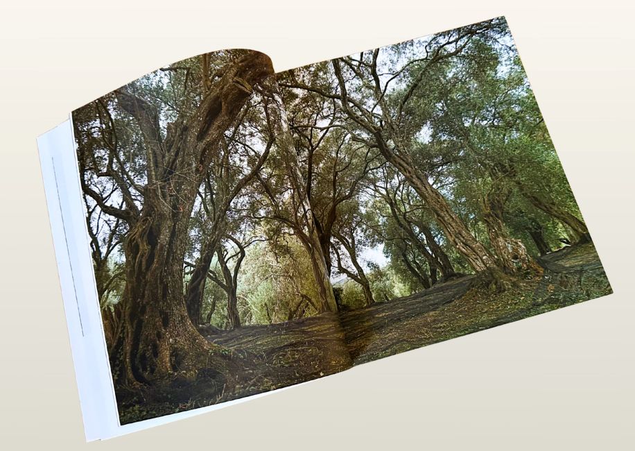 Αφετηρία της έκδοσης αποτελεί η φωτογραφική καταγραφή του κύκλου της ελιάς: από το άπλωμα των ελαιόδιχτων και τη συγκομιδή έως την παραγωγή του ελαιολάδου στο ελαιοτριβείο. Στην πορεία, ο αρχικός αυτός κύκλος ανοίγει και εμπλουτίζεται, αποκαλύπτοντας πόσο άρρηκτα δεμένη είναι η ελιά με το τοπίο, την εργασία, τη μνήμη και τον πολιτισμό της Κέρκυρας.