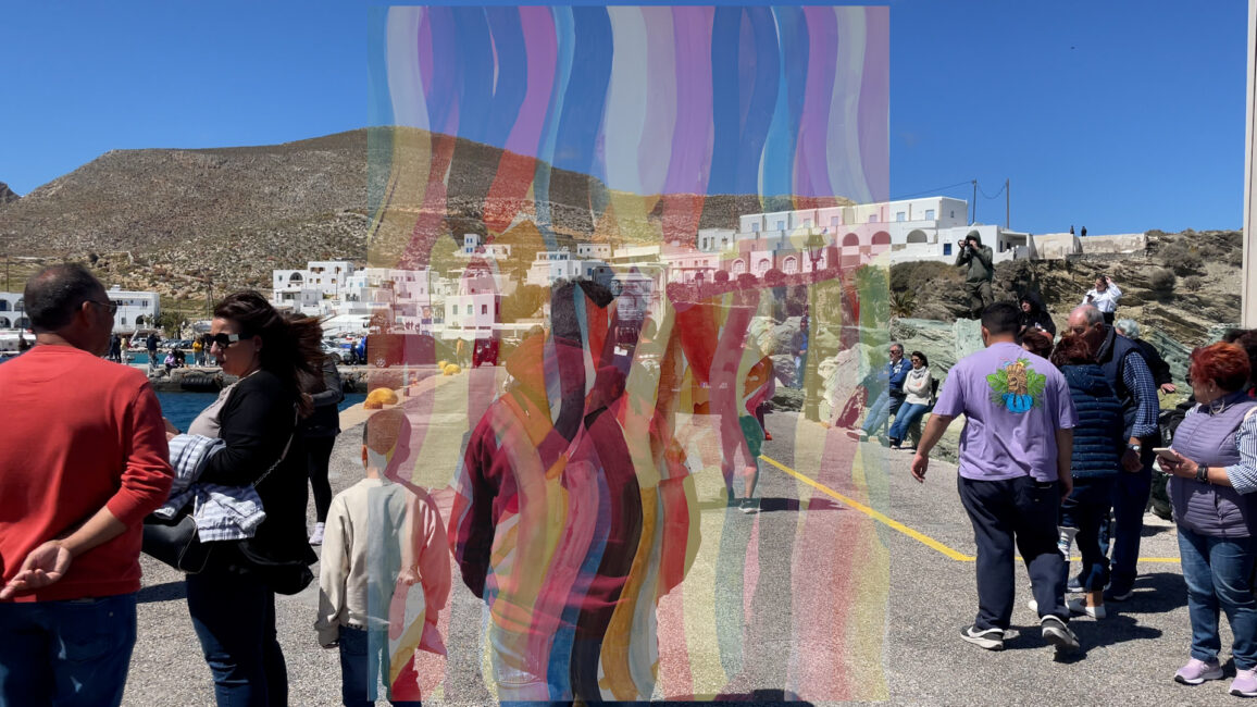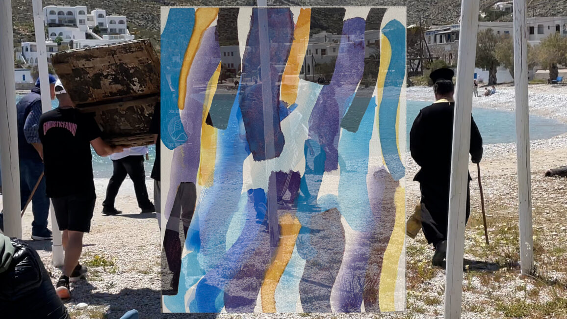 Η Erika Winstone παρουσιάζει μια εγκατάσταση που συνδυάζει τη νέα της ταινία “Hover”, ακουαρέλες σε ξύλινα πάνελ και σχέδια σε γυαλί και καμβά. Η καλλιτέχνης κινηματογράφησε τις προετοιμασίες, τις πομπές και τους εορτασμούς του Πάσχα, ενώ έμενε στο σπίτι της οικογένειας Bicknell στη Φολέγανδρο. Η έρευνα αυτή εμπλούτισε το ενδιαφέρον της για τη δημιουργία αποσπασματικών αφηγήσεων, όπως φαίνεται στα προηγούμενα έργα της La Duree (2017-19) και London Project (2019-22), τα οποία αναδεικνύουν το ενδιαφέρον της για την performance, τις ανθρώπινες σχέσεις και την αξία της κοινότητας.
