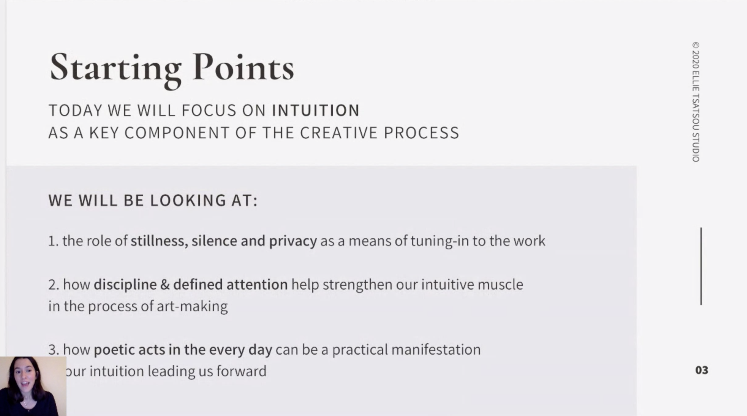 Με δύο χρόνια πανεπιστημιακής διδασκαλίας και μια δεκαετία έρευνας, μελέτης και δημιουργίας, η φωτογράφος Έλλη Τσάτσου παραθέτει από τον Φεβρουάριο έως τον Ιούνιο αυτού του έτους την πρώτη σειρά διαδικτυακών διαλέξεών της, αφιερωμένη σε αυτό που ονομάζει Integrated Creativity: μια ολιστική προσέγγιση της δημιουργικής διαδικασίας και πρακτικής, η οποία αγκαλιάζει και ενθαρρύνει την έκφραση ολόκληρου του εαυτού μας, σε όλες τις εκφάνσεις της ζωής μας, καθημερινά.