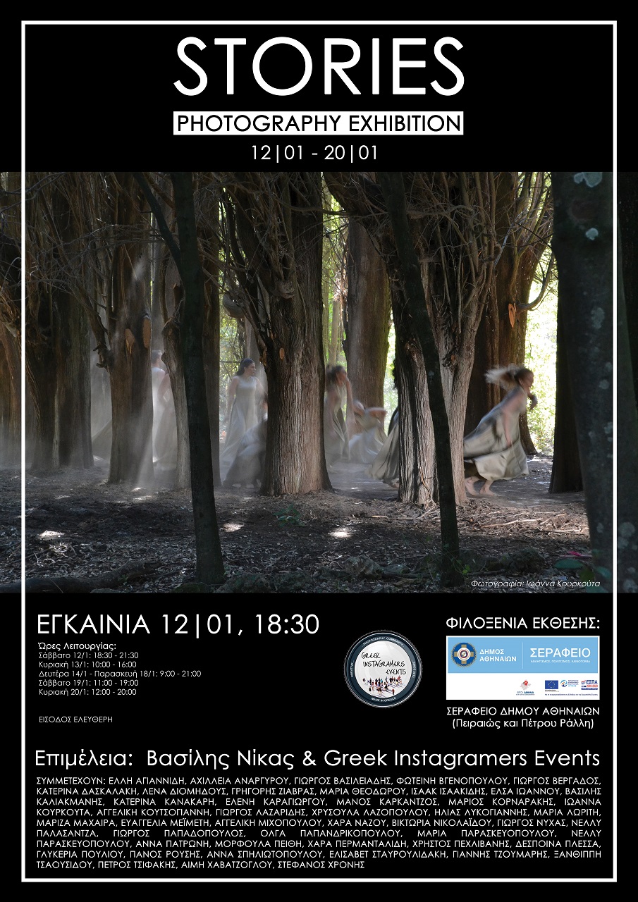 Η ομάδα Greek Instagramers Events σε συνεργασία με τον δάσκαλο δημιουργικής φωτογραφίας Βασίλη Νίκα, παρουσιάζουν την έκθεση καλλιτεχνικής φωτογραφίας “STORIES”. Μικρές και μεγάλες ιστορίες της καθημερινότητας, ιδιαίτερες στιγμές, εικόνες και συναισθήματα, μέσα από αφηγηματικού χαρακτήρα φωτογραφικές προσεγγίσεις που επιχειρούν να μας ταξιδέψουν πέρα από τα όρια του φωτογραφικού κάδρου.
