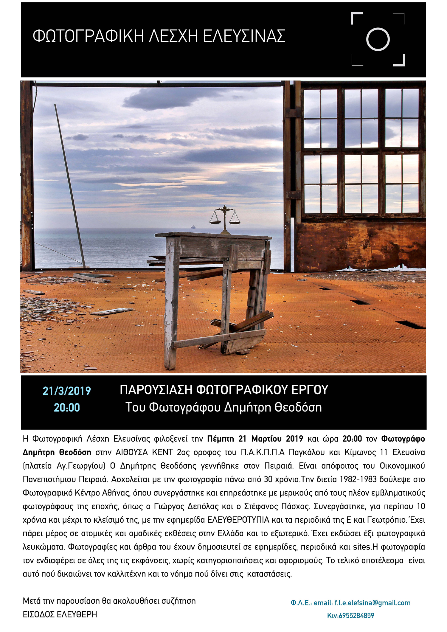Η Φωτογραφική Λέσχη Ελευσίνας φιλοξενεί την Πέμπτη 21 Μαρτίου 2019 και ώρα 20:00 τον Φωτογράφο Δημήτρη Θεοδόση στην ΑΙΘΟΥΣΑ ΚΕΝΤ 2ος οροφος του Π.Α.Κ.Π.Π.Α Παγκάλου και Κίμωνος 11 Ελευσίνα (πλατεία Αγ.Γεωργίου).