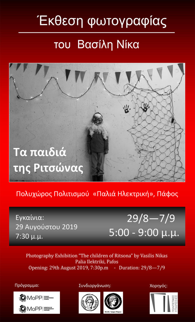 Η Φωτογραφική Εταιρεία Κύπρου – Τμήμα Πάφου σε συνεργασία με το Δήμο Πάφου παρουσιάζει την πολυταξιδεμένη έκθεση φωτογραφίας του Βασίλη Νίκα με τίτλο «Τα παιδιά της Ριτσώνας». Μια έκθεση για τους πρόσφυγες και την έννοια της ανθρώπινης ύπαρξης.